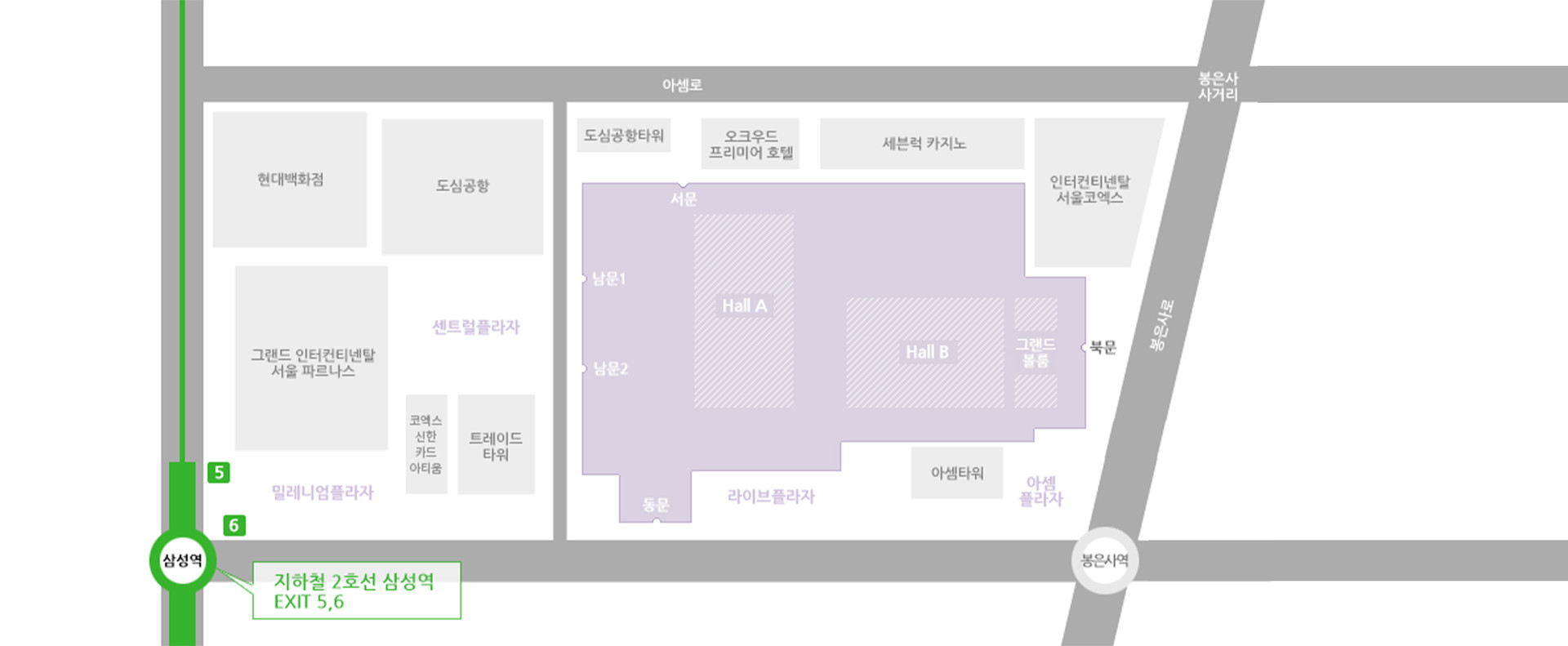 2호선 삼성역 방면 | 삼성역 5, 6번 출구와 직접 연결된 통로로 진입, 밀레니엄 광장을 통하여 코엑스몰로 진입 |